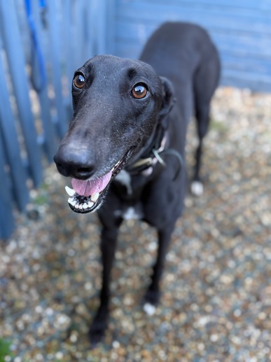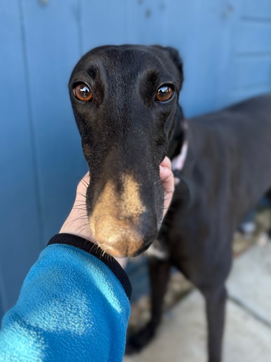 There is something about having another greyhound close by that gives her reassurance in a way we humans cannot quite replicate. Because of this, we truly feel she would do best in a home with another greyhound or two to help show her that home life can be calm, kind, and nothing to fear. She may have the potential to live as an only dog, but this would need to be a very special match with humans who are around most of the time at first, ready to offer patience, reassurance, and plenty of gentle love while she finds her rhythm.
